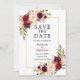 Elegante Watercolor Burgundy Floral Save O Cartão de Anúncio de Casamento de Noivado de Data inclui rosas de burlagem, rosas cor-de-rosa, rosas vermelhas e verde botânico numa armação de ouro.