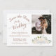 Este belo casamento Salve o cartão de datilografia apresenta um design bócio rústico com um aglomerado de rosas de aquarelas pintadas manualmente, flores e folhas de eucalipto em tons de blush de champanhe ou pêssego muito pálido. O lado esquerdo do cartão tem uma bela caligrafia escrita em que se lê "salvar a data do casamento de..." com espaço para os seus nomes, a localização e uma nota curta. À direita há espaço para sua foto acima das flores. Elegante, na moda e chic, este cartão é uma forma excelente de deixar seus amigos e família saberem salvar a data do seu dia especial.