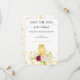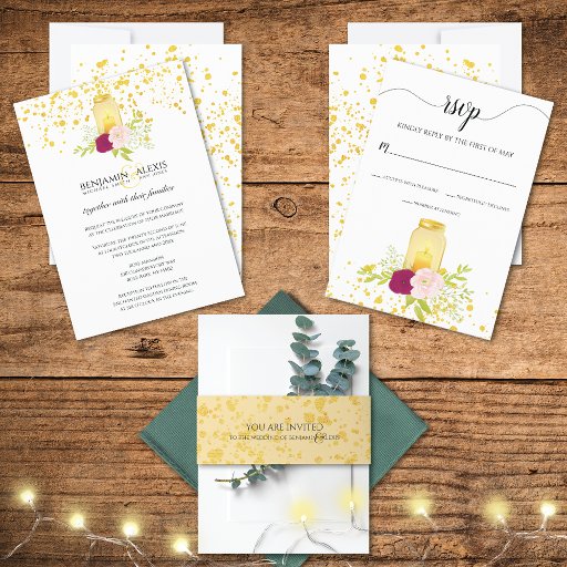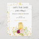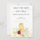 Um romântico salvou a data para um casamento de verão e uma recepção noturna. Uma vela brilhante em um pote de mason, um rosa magenta e uma rosa rosa rosa contra um fundo dourado falso brilhante. Da Suíte de Casamento Candleight e Rosas.