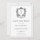 Rosas franceses legantes Monograma Floral Crest Casamento Salve o cartão de data em preto e branco eterno apresenta uma crista monograma formal destacada com rosas franceses, tipografia clássica e um quadro delicado.