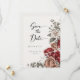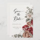 Spray clássico tradicional e elegante de rosas quentes, brancos e bronzeados, antigos e vermelhos, hálito e eucalipto de bebê em um fundo no estilo de aquarela creme com caligrafia personalizada Salve o script Data (a cor pode ser personalizada) e campos de texto editáveis. A parte traseira apresenta gráficos complementares e campos de texto adicionais.