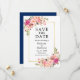 Elegante Watercolor Pink Blush Floral Save O Cartão de Anúncio de Casamento de Noivado de Data inclui rosas cor-de-rosa e verde botânico numa moldura dourada. Marinho Azul Para Trás.