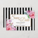 Lindos florais cor-de-rosa nos olhos pegando faixa branca e preta. O texto para nomes e data pode ser personalizado neste design. Salvar a data é criada em uma bela fonte de efeito de brilho dourado e não é editável. Os convites e as placas estão disponíveis em uma seleção de texturas e formas de papel (borda arredondada, redimensionada etc.) Você pode encontrar outros designs com muitos produtos de coordenação na loja, incluindo convites, salvar a data e as placas rsvp, obrigado que você marcar e muito mais.