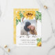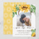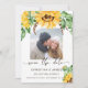 Cartão de salvar a data de casamento rústico único apresenta lindo buquê de girassóis ao longo da parte superior com pequeno buquê no canto inferior direito, sua foto favorita, tipografia caligráfica moderna e de texto utilizada. O verso do cartão é amarelo sólido com ícone de girassol branco em padrão.