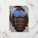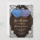 Casamento romântico roxo e azul floral salve o cartão de data com flores hipnórdicas contra um fundo de madeira de celeiro adornado com rendas florais brancas e luzes de cordas. Itens correspondentes disponíveis.