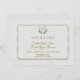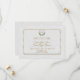 Símbolo da elegância, abundância e loftineza! Design de cartão único com uma crista real de folha de ouro falso, uma armação delicada, ramos de azeitona com uma flor branca sobre fundo de textura branca. Use a ferramenta Personalizar para adicionar suas informações. Por favor, visite minha Coleção Real de Casamentos de Crest Lush Greenery, Dourada.