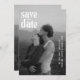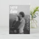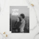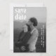 Casamento moderno salve o cartão de data apresentando um design simples e mínimo com tipografia ousada contemporânea sobre sua foto favorita. A cor das fontes pode ser alterada para qualquer cor que você escolher na ferramenta de edição de design. A parte de trás tem uma segunda imagem junto com um campo para texto adicional, como detalhes adicionais ou o site do seu casamento.