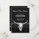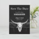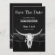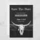 País ocidental vintage estilo antigo cowboy. Design de casamento preto-e-branco divertido, salve as cartas chatas. Convites de crânio de vaca em touro. Usa um pouco de humor com este estilo de fazenda engraçado e fofo. O script pode ser personalizado. Velho oeste selvagem, único. animal legal, de moda fazenda. Imagem copyright Marg Seregelyi Fotografia.