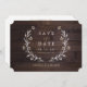 Design floral russo de flor selvagem sobre fundo de madeira castanho escuro, cartões salve a data simples e elegantes para o casamento no quintal de outono, casamento rústico de inverno, casamento de vintage boho ou casamento de jardim botânico ao ar livre. Veja todas as peças correspondentes na coleção.