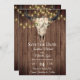 Este boho rústico Salve a data do anúncio de casamento apresenta um crânio de vaca floral com luzes bonito de cordas de flores amarelas sobre um fundo de madeira de casca. -