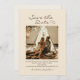 Cartões "Salve a data" com sua foto em um fundo de estilo 'boho', seu texto em um na moda, moderno, manuscrito, e acentuado com dois corações bonitinhos. Personalize com uma foto de noivado, seus nomes, data e local do casamento e seu site de casamento.