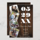 Este olho que pega Rustic Bold Four Foto Salve o Anúncio de Data vem com quatro postagens de fotos do feliz casal, uma ousada e notável data de casamento contra um fundo de madeira rústico. Personalize com suas próprias fotos e detalhes do casamento. Cores adicionais disponíveis com este design.