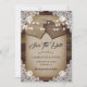 Casamento russo de campo salve o cartão de data com corações de burlap em um colete de arroto distante e fundo de madeira de celeiro adornados com rendas florais brancas e luzes de cordas.