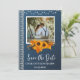 Rustic Dusty Blue Sunflower & Lace Wedding Salvem a data com fundo azul empoeirado, fundo de madeira rústico, arranjo de girassol vintage, luzes de cordas, rendas rústicas brancas, tipografia moderna e um modelo fotográfico. Um design perfeito para o tema do casamento como casamento rústico, vintage, campo e celeiro. Clique no botão personalizar para personalizá-lo com seu próprio texto.Visite gentilmente minha loja " Loveyouart" para outras designs ou convite de casamento correspondente, presentes de favorecimento e papelaria.