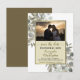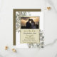 Estas cartões salve a data são uma maneira excelente de deixar seus amigos e família saberem sobre seu próximo casamento. Eles apresentam um design rústico com sua foto cercada por pinturas manuais de folhas de eucalipto e galhos de pinheiro em tons de verde-sábio e ouro sobre fundo de ouro. O título é escrito em uma caligrafia antiga com espaço para os nomes do casal, data do casamento, local e site.