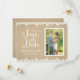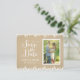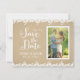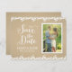Os cartões de anúncio de casamento apresentam uma foto de noivado retrato, "Save the Date", em um roteiro, um charmoso design de fronteira ilustrado de um lugar branco vintage floral e pontilhado, e um fundo com uma aparência texturizada de papel kraft castanho rústico. Duas design laterais.