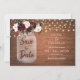 Este casamento salvou o cartão de data apresenta um fundo de madeira rústico, com um jarro de mason tocado com florais de cor d'água borrado e borrado, e luzes de cordas no topo.