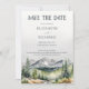 Esta bela aventura rústica começa o casamento Salve o cartão da data mostra a cor d'água das montanhas da floresta pintadas a cor d'água paisagem perfeita para o outono, inverno ou casamento de destino. Por favor, substitua a foto da amostra na parte de trás ou simplesmente apague-a para obter um belo respaldo verde de sábio.