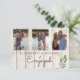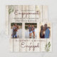 Simples e Moderno Convite ao Noivado. 3 fotos podem ser substituídas por suas. Uma folha simples figura no design rústico. A tipografia está em uma fonte moderna. Todo o texto é facilmente alterado para adicionar suas próprias informações. Este convite personalizado está sozinho, mas faz parte de um papel de carta de casamento dos Designs Finos de Chessie.