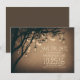 Rustic salve o convite de data com ramos de árvore e jares de mason pendurados com vagalumes brilhantes.