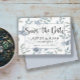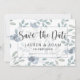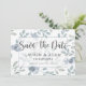 Rustic e elegante Guarde o cartão de Data, perfeito para pôr o seu casamento em movimento. Este design apresenta elementos de eucalipto e elementos florais em azul empoeirado e verde-sábio. Personalizar com suas informações exclusivas,