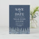 A rustic save the date card for your winter wedding with a nighttime snow covered forest in navy blue and white.
