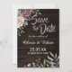 Uma placa 'Salve a Data' rústica com aglomerados de rosas pintados em tons de rosa poeirento em um fundo de madeira rústica escura. Você pode adicionar seus detalhes pessoais na guia editar design. Isto é parte de uma bela suíte de casamento com convite correspondente e outras essências de casamento.