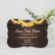 Casamento personalizado de madeiras rústicas e girassóis, salvo cartões de data com flores de girassol em fundo de madeiras rústicas. Dois corações de burlap com iniciais nas costas. Itens correspondentes disponíveis.
