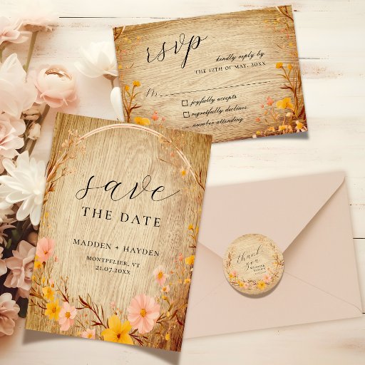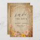 Rústico Nêutrico Boho Floral Floral Wildflower Faux Wood Olhe Casamento Salve o Convite para Data. * Nota - não é usada madeira real na criação deste item.