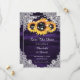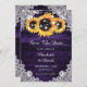 Casamento de púrpura e girassol, exceto cartões de data com girassóis e rendas florais brancas contra um fundo de madeira rústica. Itens correspondentes disponíveis.