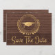 Parabéns ao formando! Fundo russo de madeira com boné de cor dourada e emblema elegante. Graduação moderna Salve o cartão de lançamento Data. Texto de estilo moderno. Adicione a sua própria mensagem no verso dos cartões, dando detalhes à sua família e amigos para salvar a data de uma cerimônia de graduação, evento, festa ou outra ocasião. O estilo de logotipo design inclui folhas de louros, estrelas e um boné de formatura.