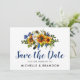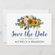Cartões de salvar a data em aquarela boho azul-marinho e amarelo com um fundo branco clássico que pode ser alterado para qualquer cor, uma exposição floral de girassol rústica, penas e um modelo de salvar a data de casamento.