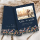 Salvar a Data de Casamento Boho Foto Moderna Azul Marinho. Este salve a data de casamento elegante e moderno apresenta belas flores silvestres pintadas à mão em aquarela, dispostas como um lindo buquê perfeito para casamentos de primavera, verão ou outono. Encontre itens correspondentes na Coleção de Casamento de Flores Silvestres Boho Azul Marinho.