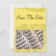 Este anúncio elegante "Salvar a data" com itens correspondentes foi projetado com um fundo espiral amarelo quebrado de arte digital e um banner de onda de cores complementar na parte superior frontal. O design pode servir para qualquer ocasião quando você preencher os campos modelo com seus detalhes, remover informações indesejadas e/ou clicar no botão Personalizar cor laranja para selecionar um estilo de fonte, tamanho e cor que você preferir na frente e no verso. Na frente, substitua a foto de modelo com a sua foto e ela está pronta. Abaixo, você verá o envelope tamanho A6 no qual o anúncio será ajustado, um adesivo em forma de coração correspondente para incluir com o cartão de anúncio, um selo postal para enviar esta combinação sofisticada e um ímã quadrado.