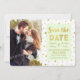 Cartão de anúncio de casamento personalizado com foto em verde hortelã pastel claro e branco com padrão de confete dourado e texto em estilo letra à mão. Personalizável com os detalhes do seu casamento e sua própria foto, disponível em uma ampla gama de produtos de casamento correspondentes. Entre em contato conosco para solicitar uma mudança de cor ou um produto personalizado.