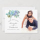 Cartão de salvar a data de casamento boho floral em verde menta e azul com penas de pavão projetado para ser personalizado rápida e facilmente para o seu dia especial.