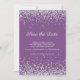 Cartão elegante de salvar a data de casamento roxo com brilho prateado cintilante. Personalizado com os nomes da noiva e do noivo e a data e local planejados para o casamento.