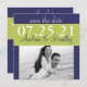 O texto e a foto de noivado neste cartão moderno de "save the date" de casamento com fotos, verde de primavera e azul-marinho são totalmente personalizáveis. Você pode alterar a maioria dos textos e a foto de noivado usando a opção personalizar. Para alterar o resto do texto ou fazer alterações mais extensas no cartão, incluindo alterar a fonte, a cor da fonte ou a colocação do texto, use a opção personalizar. Você também pode alterar o tipo de papel nas opções de convite. Este é um belo cartão de "save the date" para um casamento com um esquema de cores verde primavera e azul-marinho.