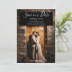Anúncio de Salvar a Data de Foto Moderna com um design de texto simples em uma caixa delineada moderna esperando pela sua foto e detalhes do casamento para personalizar. Perfeito para o casal que deseja um design moderno para o anúncio do seu casamento.