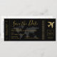 Bilhete de Plano de Passagem Salve o Cartão de Convite de Data em pintinho e elegante preto e ouro para um Casamento de Destino moderno com logotipo de avião romântico e mapa mundial de fundo e espaço no verso para informações de viagem e acomodações para os hóspedes começarem a planejar sua viagem para comemorar seu casamento no meio de uma férias. Um dos muitos temas de viagem economiza as datas e os convites criados após trabalhar diretamente com casais criativos e aventureiros que viajaram pelo mundo juntos ou se encontraram enquanto trabalhavam na indústria do viagem. Entre em contato com o Designer do Zazzle Destinos de Capa de Papel diretamente via chat do Zazzle com ideias que você tem para personalizar o modelo com os detalhes do seu casamento em mente.