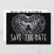 Um pingente bauble joalharia intricadamente criado, com acabamento metálico prateado brilhante refletindo a luz contra um fundo profundo e escuro. Salvar a Data é gravada em letras grandes na frente, com vários campos de texto personalizáveis no verso para suas informações especiais.
