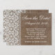 Anúncio de convite simples de estopa e renda para salvar a data em cartões planos. O tema natural é ótimo para um casamento rústico, ao ar livre ou no campo. Imagem texturizada e áspera da estopa contrasta com a renda delicada e elegante. Copyright © www.CustomInvitesOnline.com