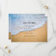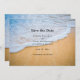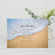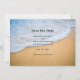 Salve o cartão de encontro com uma fotografia de uma praia ouro marrom arenosa com surf branco e água azul.