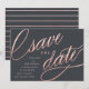 Estes save the dates únicos e modernos apresentam uma escrita sofisticada num efeito de folha de dourado rosa falso num fundo cinza, com os detalhes do anúncio do casamento em branco. O verso apresenta um padrão de listras dourado rosa trendy.