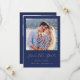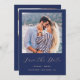 Este simples e minimalista Cartão Salvar a Data contém uma foto quadrada acima das palavras "Salvar a Data" em um elegante roteiro de escrita rosa, seguido pelos nomes do casal, data do casamento e cidade em sans serif em um fundo azul marinho. Adicione uma segunda foto horizontal e uma mensagem mais detalhada com informações adicionais sobre o contrário.