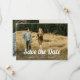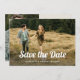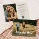 Esse casamento de estilo de tendência e vintage salva o recurso de cartões de data na frente como uma sobreposição na sua foto. O fundo tem um fundo neutro de creme de marfim com texto boho marrom terracotta e outra foto, junto com um código de QR digitalizável para adicionar seu site de casamento.