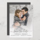 Espalhe a palavra do seu próximo casamento com estas simples e modernas cartões salve a data fotográficas. O texto da cinza de carvão diz "Salvar a Data" em um script elegante de escrita manual com florescimento antes e depois. Substitua a imagem de exemplo por sua foto favorita e adicione seus nomes junto com a data e o local do casamento. Um filtro de gradiente branco ajuda a fazer o pop de texto.
