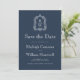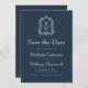Este elegante casamento inspirado na vintage Save the Date design apresenta um par de iniciais brancas monográficas em letra serif aberta acima e abaixo de uma linha divisória e rodeada por uma crista de acanthus de uma linha em um fundo azul marinho. A parte traseira da placa é azul marinho estável.