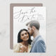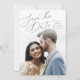 Um design simples e elegante com seus detalhes de casamento alinhados no topo, esta foto vertical salva a data com um roteiro letal. Personalize com seus nomes, data do casamento e local ao lado, e adicione detalhes adicionais às costas. Devido à natureza delicada da inscrição, este estilo é recomendado para fotos verticais com ampla luz ou espaço em branco no topo.