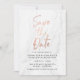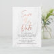 Casamento moderno de na moda guarde as datas que contêm uma fonte falsa de roteiro de folha de rosa dourada, fundo de mármore branco e espaços reservados para suas informações personalizadas de casamento. A parte de trás da data de salvamento pode ser alterada para uma cor de sua preferência com a ferramenta Personalizar.